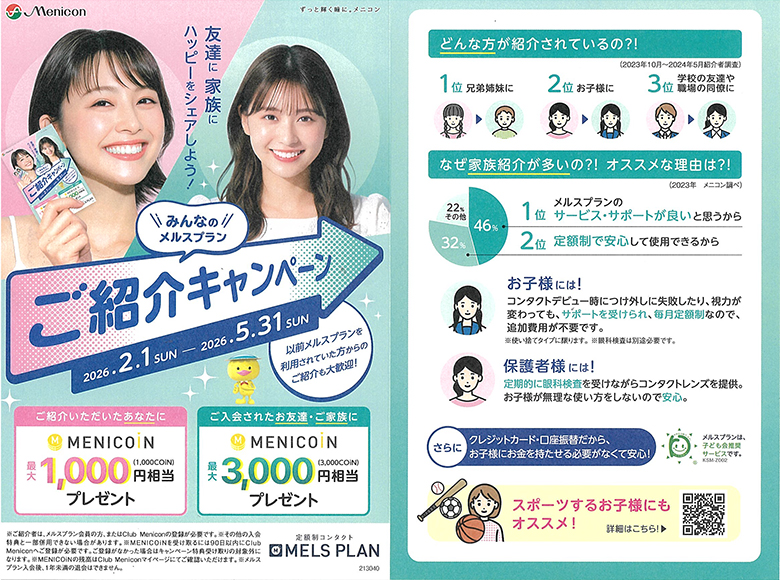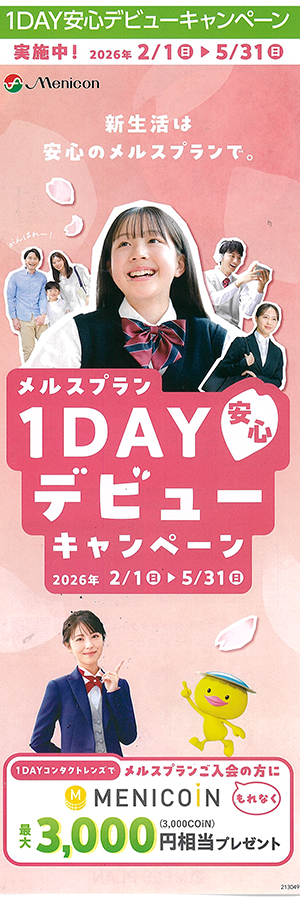 キャンペーン期間: 1DAYコンタクトレンズでメルスプランご入会の方、MENICOIN3,000円相当 プレゼント 詳しくは ▶︎こちら(PDF) |